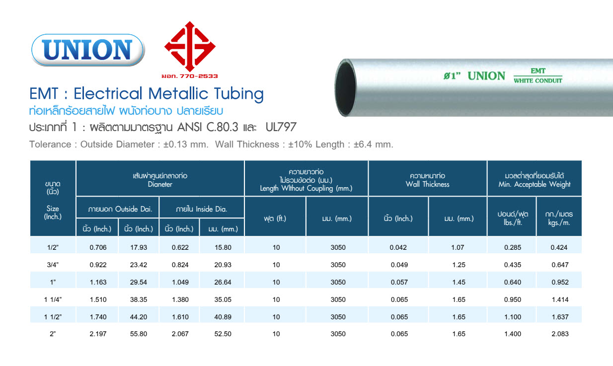 ท่อเหล็ก EMT 2" ยูเนี่ยน UNIONEMT : Electrical Metallic Tubingท่อเหล็กร้อยสายไฟ ผนังท่อบาง ปลายเรียบประเภทที่1 : ผลิตตามมาตราฐาน ANSI C.80.3 และ UL797 ดาวน์โหลด: สเปกสินค้า